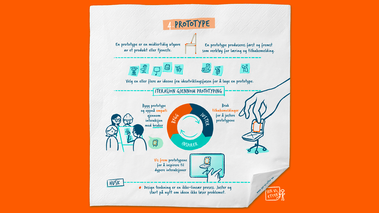 Design tenkning består av fem essensielle steg: Empati, definere, ideutvikling, prototype og test. I de ulike fasene er det fokus på intuisjon, kreativitet og analytisk tilnærming til design prosessen. Målet gjennom hele design tenkning prosessen er å få en dyp forståelse brukeren og hvilke ønsker og behov du skal avdekke og forstå.