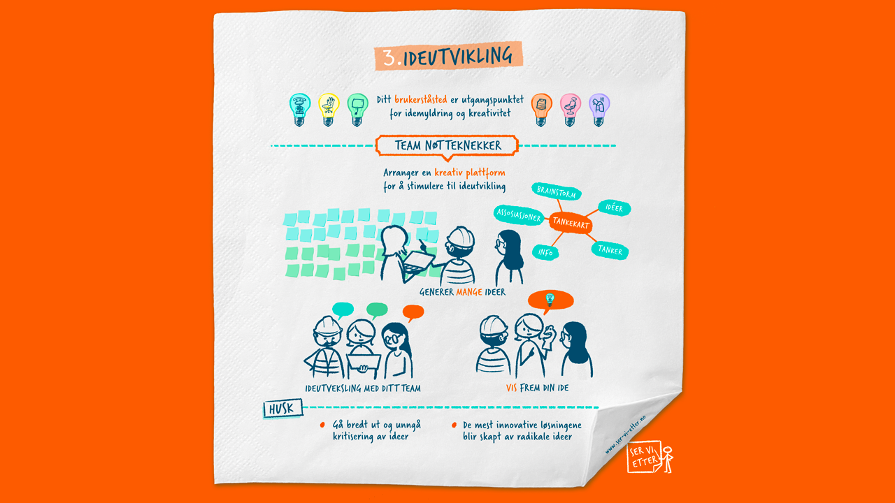 I ideutviklingsfasen jobber vi med idemyldring og kreativitet. Målet for denne fasen er å utforske og å generere ulike løsninger ved hjelp av ditt brukerståsted. Ideutvikling er et viktig steg i overgangen fra å identifisere problemet til å utforske løsninger. Arranger en kreativ workshop for å stimulere til ideutvikling. Benytt denne fasen til å skape mange ideer som senere kan brukes for å lage prototyper.