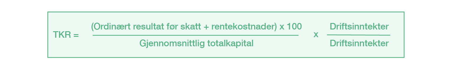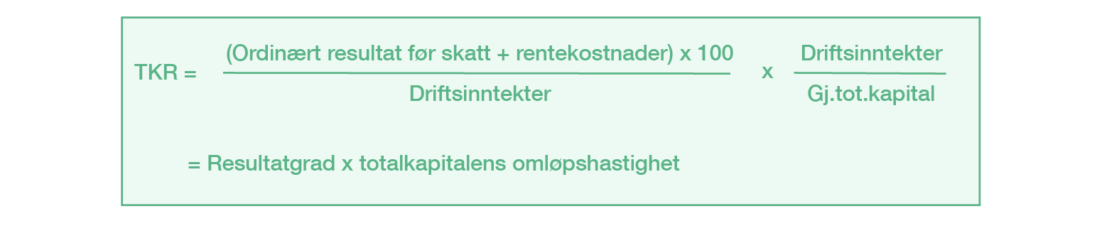 For å forstå hva som har størst betydning for totalkapitalens rentabilitet, må nøkkeltallet dekomponeres (= spittes opp). TKR dekomponeres ved å multipliseres TKR med driftsinntektene i teller og nevner: