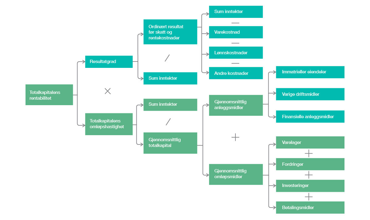 Lønnsomheten til selskapet er avhengig av resultatgrad og kapitalens omløpshastighet. Lønnsomheten på eiernes kapital (egenkapitalrentabilitet) er i tillegg avhengig av gjennomsnittlig gjeldsrente og selskapets gjeldsgrad (gjeld/egenkapital).